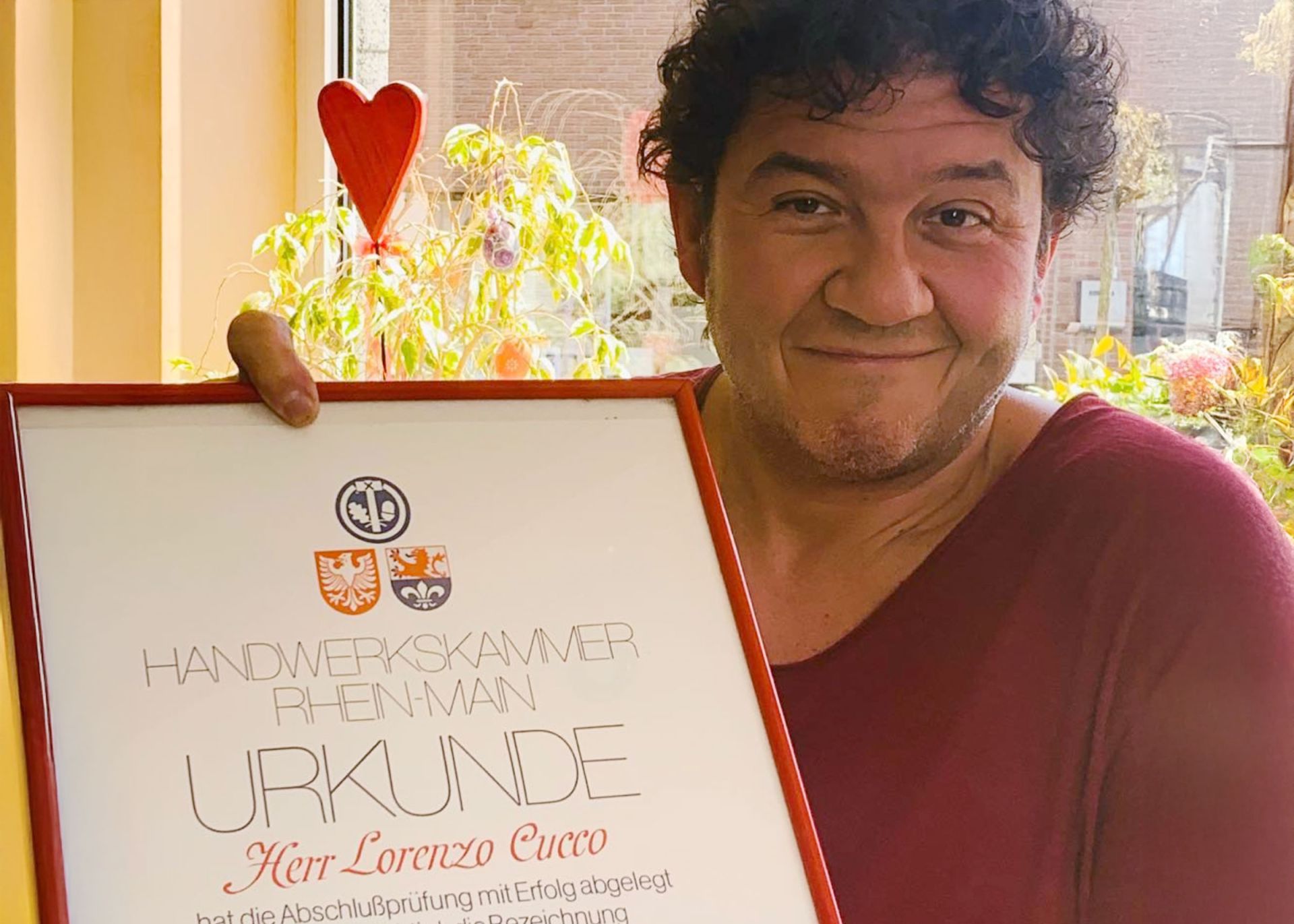 Im Jahr 1991, vor genau 33 Jahren, legte er seine Abschlussprüfung bei der Handwerkskammer Rhein-Main erfolgreich ab. Das Eismacher-Handwerk wurde Lorenzo buchstäblich in die Wiege gelegt: Schon sein Großvater und Vater waren leidenschaftliche Eismacher. Seit nunmehr 65 Jahren verzaubert die Familie Cucco uns mit ihren unverwechselbaren Eiskreationen – und das voller Liebe, Leidenschaft und mit Zertifikat!